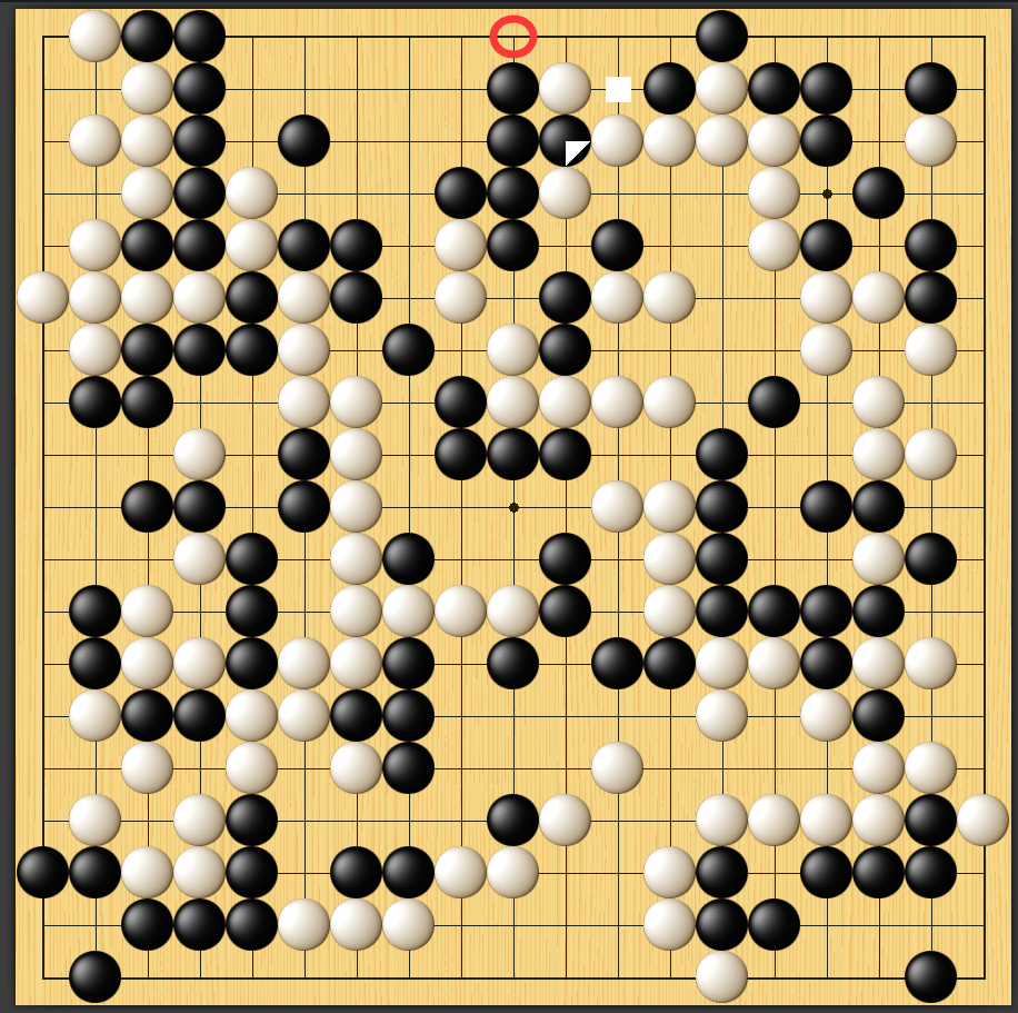 幸好王星昊一直在苦苦坚持,继续收官,当他在上边盘二路挤一手(上图三角位)时,安成浚如果能弈出一路扳(上图红圈位)的先手官子,王星昊这盘棋将很难翻盘。实战安成浚不识“扳头”,而是一老一实地选择二路粘住(上图方块位),给了黑棋趁势先手搜刮获利之机,此后官子稍有出入,但黑棋小胜局面已难以扭转。至297手终局,黑棋以1目半之优胜出。