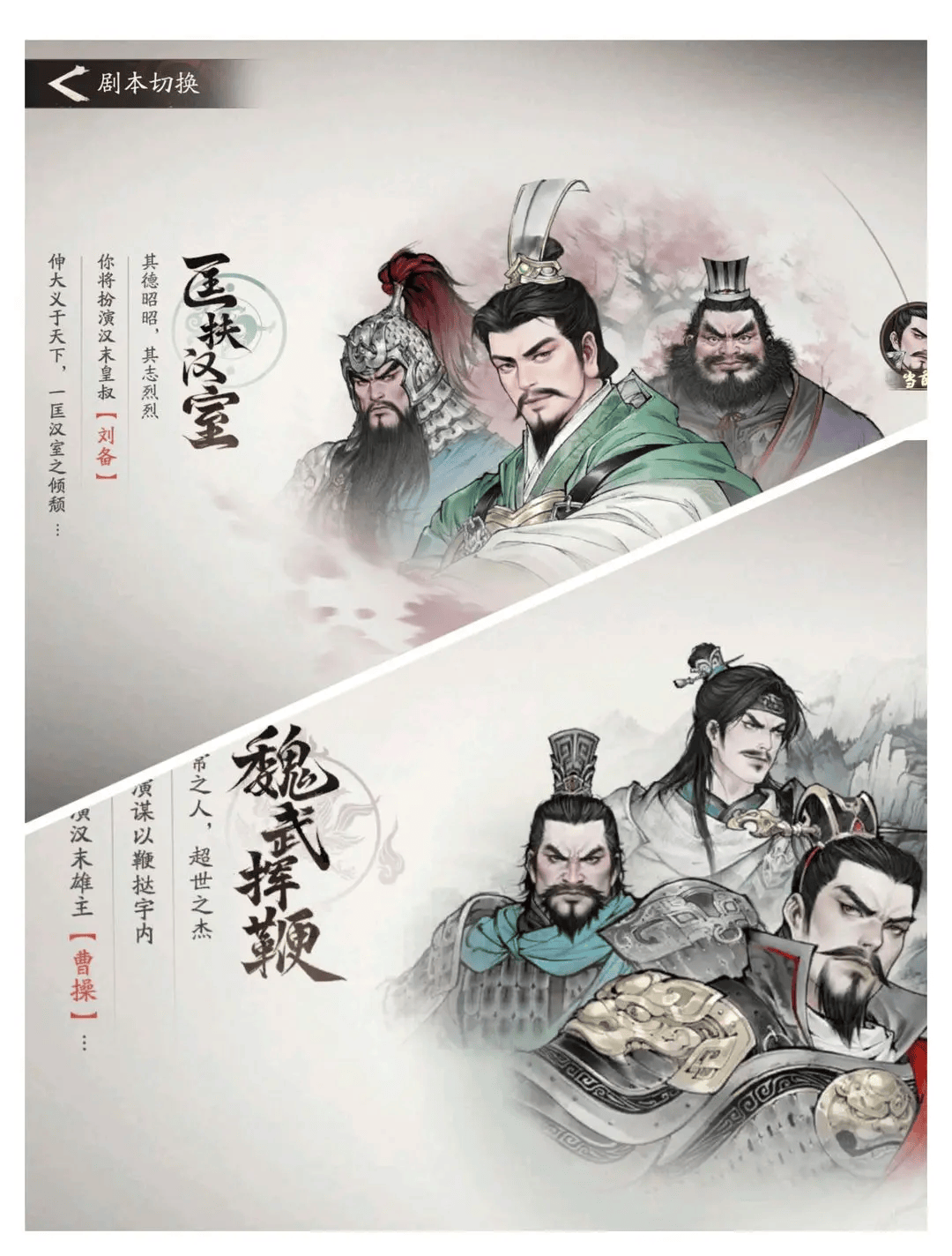 剧情用到了第一视角叙事的方式,玩家在「魏武挥鞭」和「匡扶汉室」的剧本中,以曹操和刘备的视角去经历乱世,体验两位三国霸主的一生,这不仅是对三国故事的重新解读,还能加深对历史人物的了解,这种对历史的解读方式,是当下游戏市场中比较少见的。