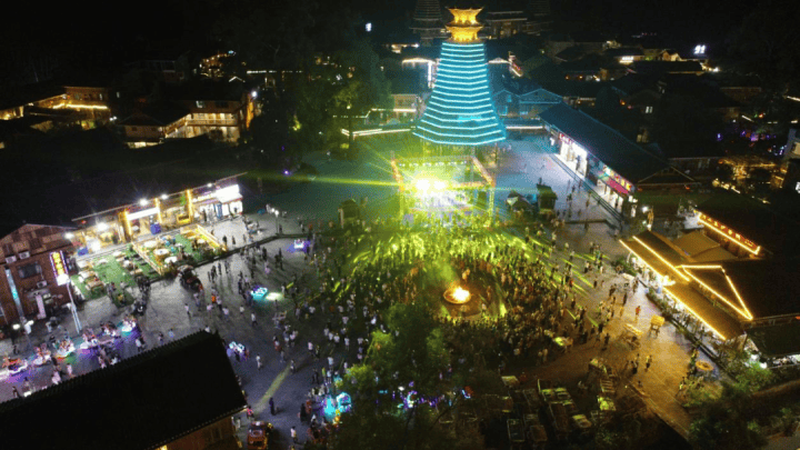 暮色降临,寨沙侗寨广场的篝火准时被点燃,侗族热情好客的“哆嘢”团结篝火晚会随之启幕。来自五湖四海的游客牵手成圈,踏着节拍起舞。雕梁画栋的钟鼓楼,此刻也亮起了璀璨华灯。钟鼓楼旁,500多岁的金丝楠木苍老而虬劲。