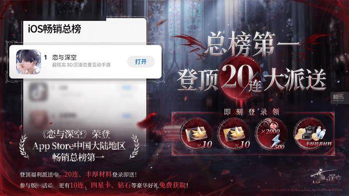 12月2日,叠纸旗下游戏《恋与深空》2.0版本新日卡“银翼安魂地”系列活动正式上线小时登顶App Store中国大陆地区游戏榜,截至当日16时,《恋与深空》荣登App Store中国大陆地区畅销总榜第一。