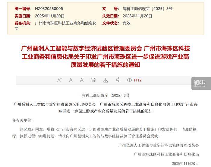 2025年11月20日,广州市海珠区科技工业商务和信息化局印发《广州市海珠区进一步促进游戏产业高质量发展的若干措施》(下文简称《措施》)。政策围绕企业培育、研发创新、出海拓展、电竞培育等关键环节推出系统性扶持举措,以最高500万元的单项资金支持力度,旨在将海珠区打造成为游戏产业的创新策源地和生态集聚区。