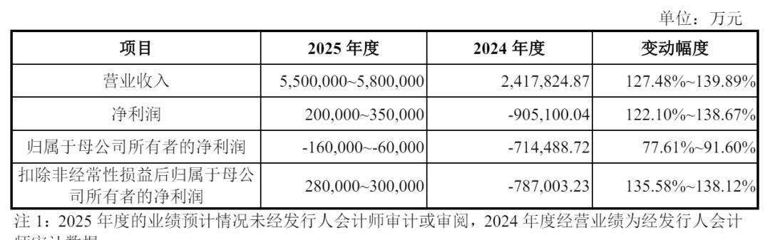 长鑫存储预计2025年营收为550亿到580亿元,较上年同期的242亿元增长127.48%到139.89%;净利为20亿到35亿,上年同期的净亏损为90.5亿;扣非后净利为28亿到30亿,上年同期的扣非后净亏损为78.7亿元。