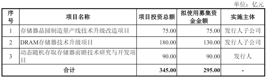长鑫存储计划募资295亿,其中,75亿元用于存储器晶圆制造量产线亿用于DRAM存储器技术升级项目,90亿元用于动态随机存储器前瞻技术研究与开发项目。