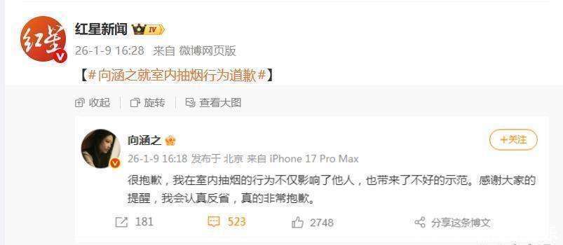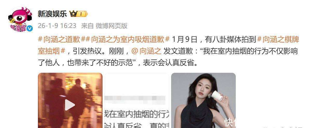 1月9日,演员向涵之因在棋牌室内吸烟的画面被曝光,引发了广泛关注和热议。相关话题很快登上了热搜榜。就在事件发酵的当天,向涵之通过微博迅速发布了道歉声明,语气直接且态度迅速,许多网友戏称:这届艺人的危机公关,反应速度可见一斑。