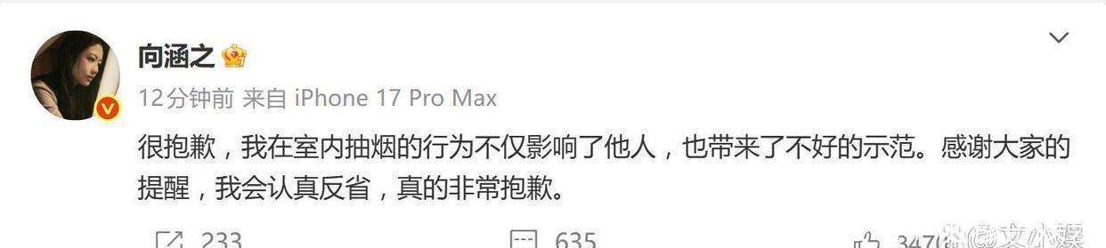 事件被揭露后,向涵之并没有选择沉默或辩解,而是第一时间在微博发布了道歉声明。她直言:我在室内抽烟的行为不仅影响了他人,也带来了不好的示范。这一句话直接指向了两个争议点:一是对他人健康的影响,二是作为公众人物产生的负面示范效应。她在声明中多次表示感谢外界的提醒,并使用了认真反省、很抱歉和真的非常抱歉等词语,充分表达了自己的悔意。