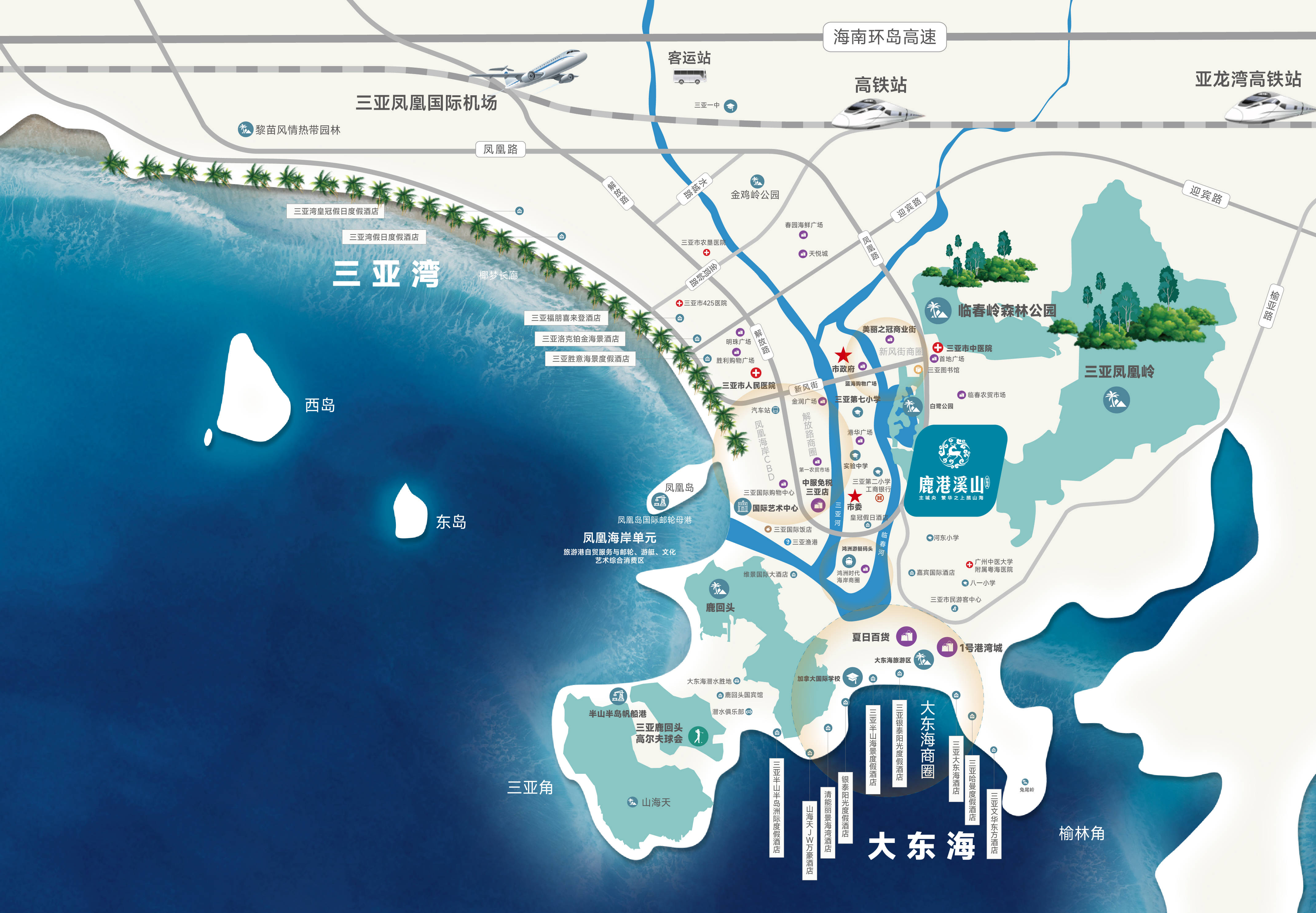 紧邻三亚中央商务区,南面大东海,北面迎宾路,东靠凤凰岭,西面三亚湾、大东海双湾交汇,门前是三亚的母亲河:临春河和三亚河,尽占城芯地利,矜贵地脉,以城芯、半山、瞰海、临河的天际视野,著写当世向往。