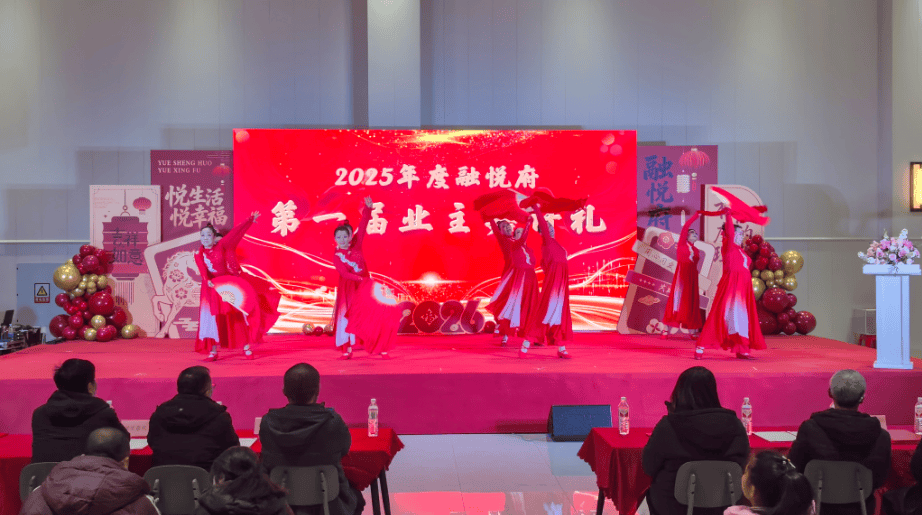 随着欢快的旋律响起,业主家人带来的开场舞《鸿运九霄》惊艳亮相,灵动的扇舞瞬间点燃全场热情。晚上 6 点 40 分,盛典在全场掌声中正式拉开帷幕。