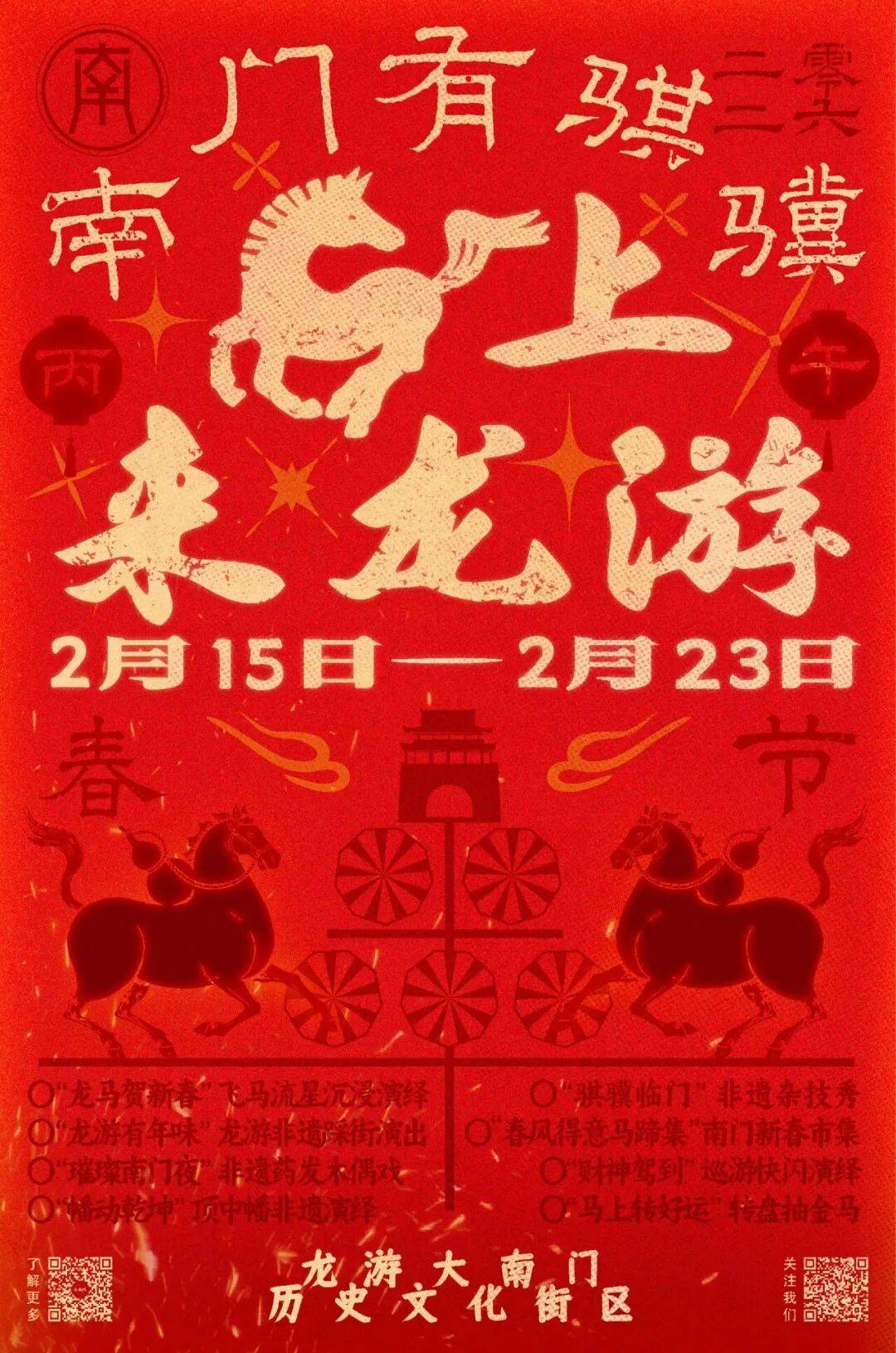 “龙马贺新春”飞马流星沉浸演绎、“骐骥临门”非遗杂技秀、“春风得意马蹄急”南门新春市集、“璀璨南门夜”非遗药发木偶戏、“财神驾到”巡游快闪演绎、非遗大巡游、大南门板凳龙,沉浸式解锁新春限定体验,年味直接拉满值,这场热闹必须赴!
