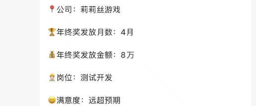 莉莉丝游戏: 年终奖发了4个月, 发放金额8万(岗位测试开发)。2025年莉莉丝其实挺矛盾的:赚钱是线个亿、研发6年的《远光84》公测翻车,《生活派对》也裁了 。唯一亮点是投资的帕鲁like游戏《Palmon: Survival》起来了,月流水冲到大几千万 。代表作品还是《万国觉醒》《剑与远征》系列。
