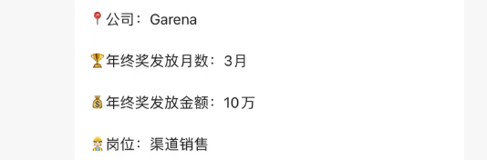Garena(上海): 年终奖发了3个月,发放金额10万(岗位渠道销售)。