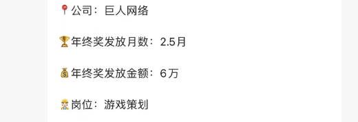 巨人网络: 年终奖发了2.5个月,发放金额6万(岗位游戏策划)。巨人2025年势头挺猛,前三季度营收33.68亿元,净利润14.31亿元 。主要靠的是新爆款《超自然行动组》,同时在线万,成了现象级产品 。老牌IP《征途》系列也特别稳,《原始征途》月均流水能保持在1个亿 。再加上《球球大作战》和《太空杀》这些老产品表现也不错,整体业绩就这么带起来了。