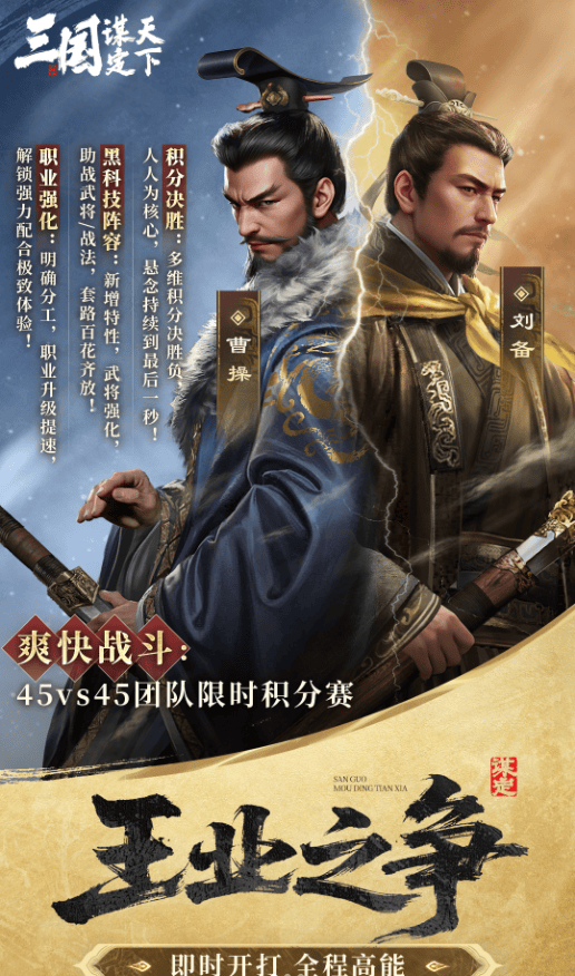 值得一提的是,近期《三国:谋定天下》全新推出的45V45创新玩法“王业之争”已开启全面测试(此前仅进行过小范围区服测试),未来该玩法将在全赛季上线。这个玩法打破了传统SLG的对战框架,带来全新的策略体验:以积分决胜为核心,个人积分与阵营积分结合,玩家可自主选择前线杀敌或后方开垦,都能获取积分,平均不到一小时的对局时长,让大家利用碎片时间就能参与;每轮对战随机生成的专属战场特性与三名强化武将,搭配各职业新增的天赋,让配队不再固化,玩家需要根据随机元素灵活调整策略,才能在战场中占据主动;局内无需操心武将等级与资源配置,补兵加速、重伤快恢、秒回城等设置拉满续航,大家只需专注排兵布阵即可。