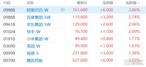 权重科技股集体走强,阿里巴巴涨近4%,百度涨近3%,京东、快手涨2%,小米、美团、网易涨超1%,腾讯控股涨近1%。