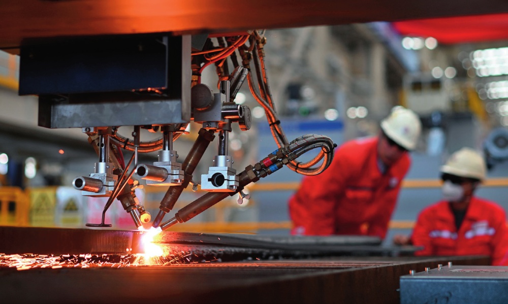 工作人员在海油工程天津智能制造基地制管作业车间调试数控切板机(2024 年 10 月 10 日摄)赵子硕摄 / 本刊