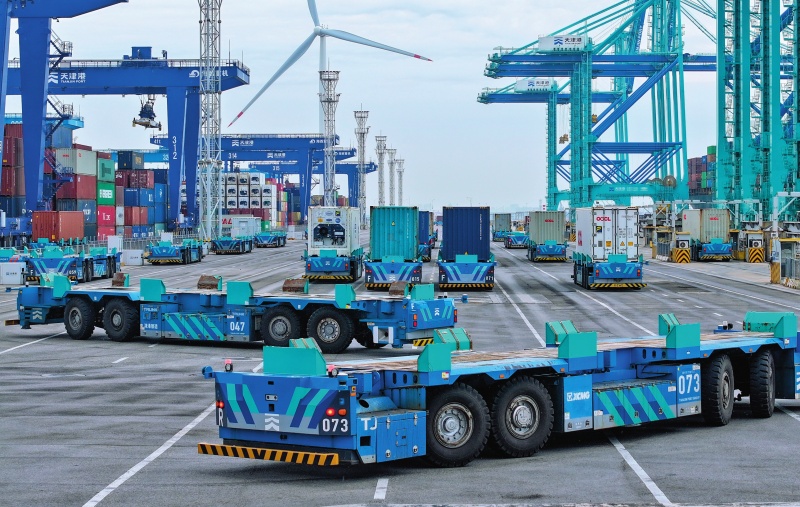 智能水平运输机器人行驶在天津港第二集装箱码头(2025 年 6 月 19 日摄)赵子硕摄 / 本刊