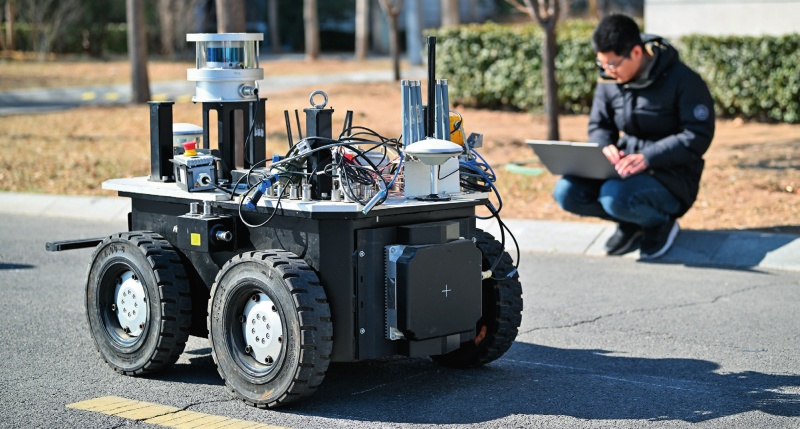 工程师在京津中关村科技城道路上对一款防爆轮式巡检机器人进行路测调试(2025 年 2 月 20 日摄)孙凡越摄 / 本刊