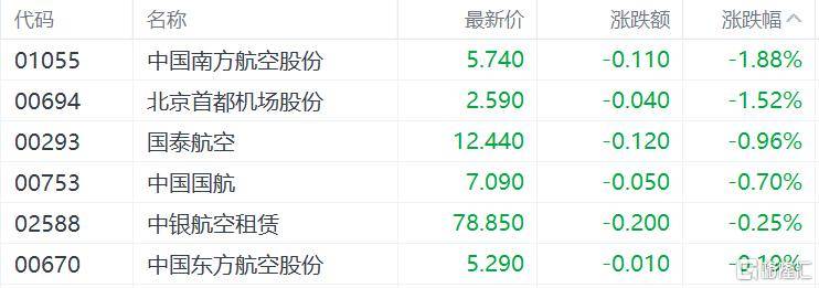 航空股下跌,中国南方航空股份、北京首都机场股份跌超1%,国泰航空、中国国航、中国东方航空股份跟跌。