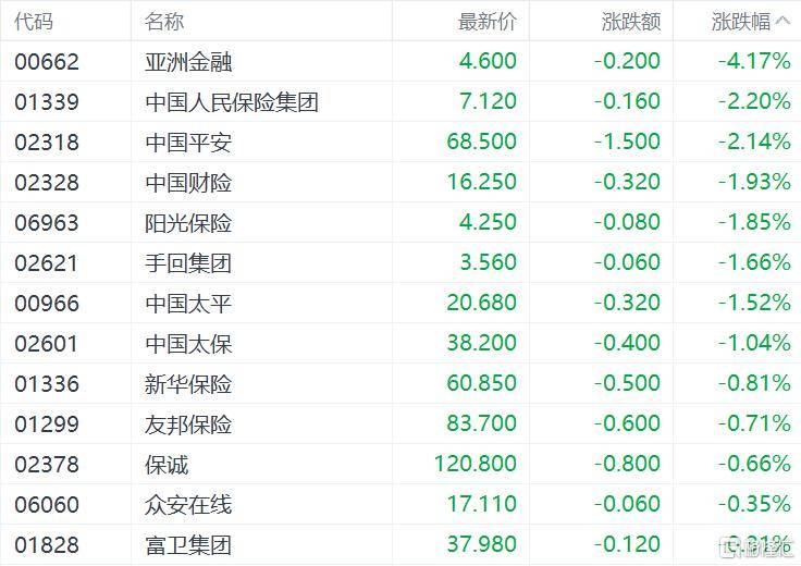 保险股全天低迷,亚洲金融跌超4%,中国人民保险集团、中国平安跌超2%,中国财险、阳光保险、中国太平、中国太保跌超1%。