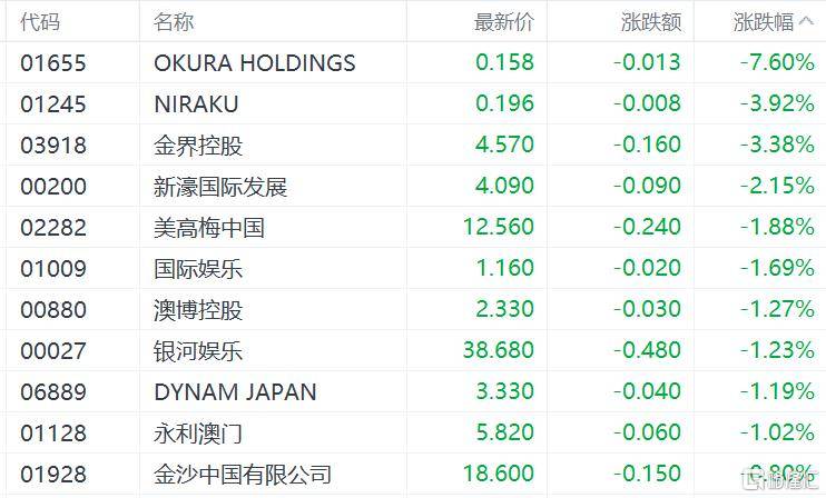 博彩股跌幅靠前,金界控股跌超3%,新濠国际发展跌超2%,美高梅中国、国际娱乐、澳博控股、银河娱乐、永利澳门跌超1%。