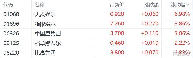 影视股部分上涨,大麦娱乐涨近7%,猫眼娱乐、中国星集团涨超3%,稻草熊娱乐涨超2%。