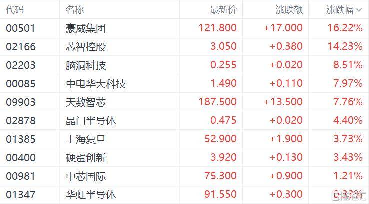 半导体股普涨,豪威集团涨超16%,芯智控股涨超14%,脑洞科技涨超8%,中电华大科技、天数智芯涨超7%,晶门半导体、上海复旦、华虹半导体、中芯国际跟涨。