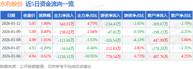 1月12日的资金流向数据方面,主力资金净流入543.51万元,占总成交额4.75%,游资资金净流出234.43万元,占总成交额2.05%,散户资金净流出309.07万元,占总成交额2.7%。