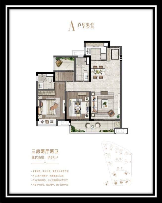 约 90㎡的三房两厅一卫户型,布局紧凑合理,空间利用高效,十分适合首次置业的年轻家庭。入户玄关设计,增加收纳空间,保护家庭隐私。客厅与餐厅相连,一体化设计使空间开阔通透,外接景观阳台,引入充足阳光与清新空气,同时也拓展了生活空间,可摆放桌椅,享受户外风景。厨房采用 “L” 型设计,操作台面充足,洗切煮动线流畅,满足日常烹饪需求。三间卧室布局合理,主卧空间宽敞,可放置双人床和衣柜,保证舒适睡眠环境;次卧可作为儿童房或书房,满足不同需求。卫生间干湿分离,提高使用效率,保持空间干爽。整体户型功能齐全,在有限面积内实现舒适居住体验。