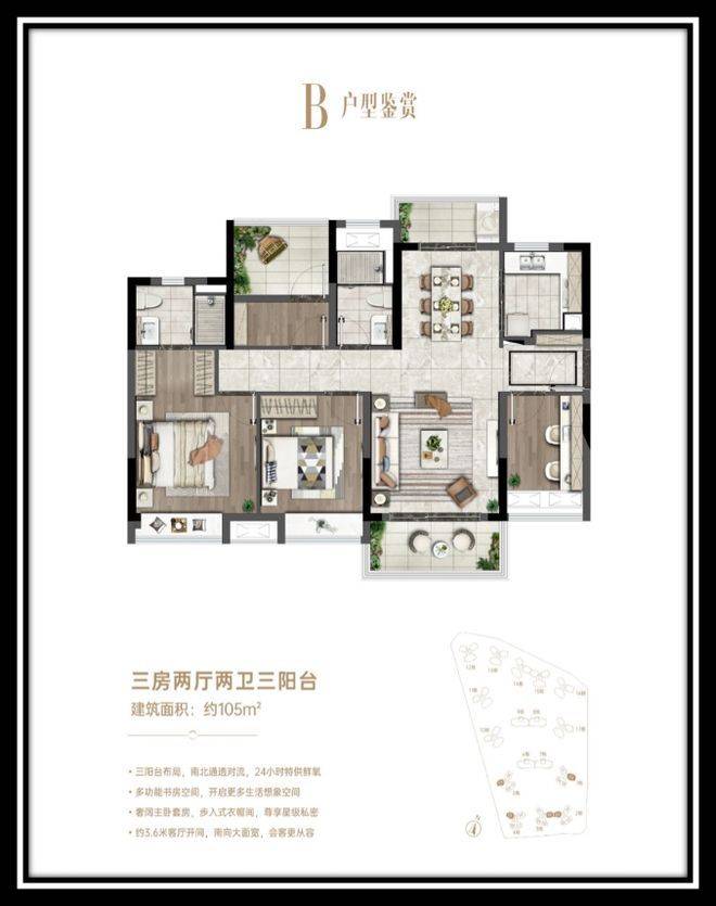 此户型在空间尺度上更为舒适,为家庭提供更充裕的生活空间。客厅面宽较大,连接景观阳台,视野开阔,让室内空间更加通透。餐厅与厨房紧密相连,方便用餐,厨房操作空间宽敞,可进行多样化烹饪。主卧套房设计,配备独立卫生间和飘窗,提升居住私密性与品质感,主人可尽情享受专属舒适空间。次卧和儿童房布局合理,空间适宜,可根据家庭成员喜好进行个性化布置。此外,该户型注重细节设计,如各个房间的窗户位置和大小,都经过精心考量,保证采光和通风效果最佳,让居住者能充分享受阳光与清新空气。